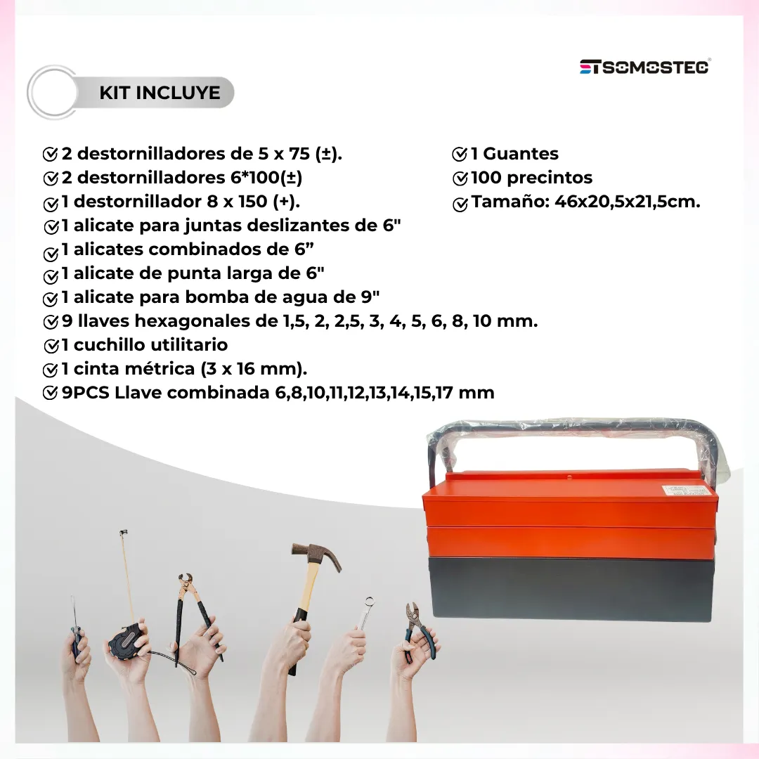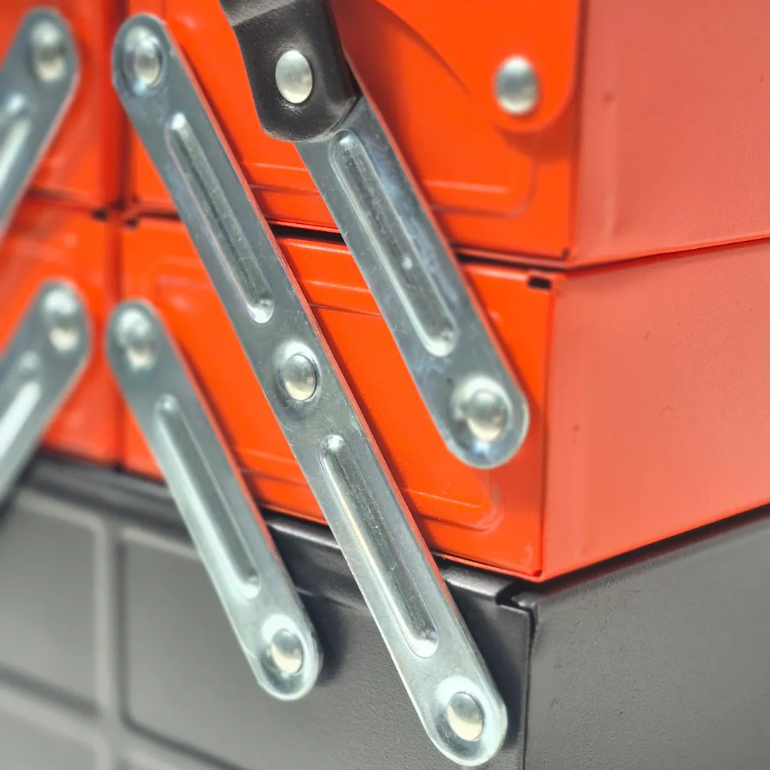 La caja es compacta y portátil, ideal para llevarla a cualquier lugar donde necesites trabajar. Gracias a su diseño tipo acordeón, su almacenamiento es práctico y eficiente, sin comprometer el espacio necesario para las herramientas.