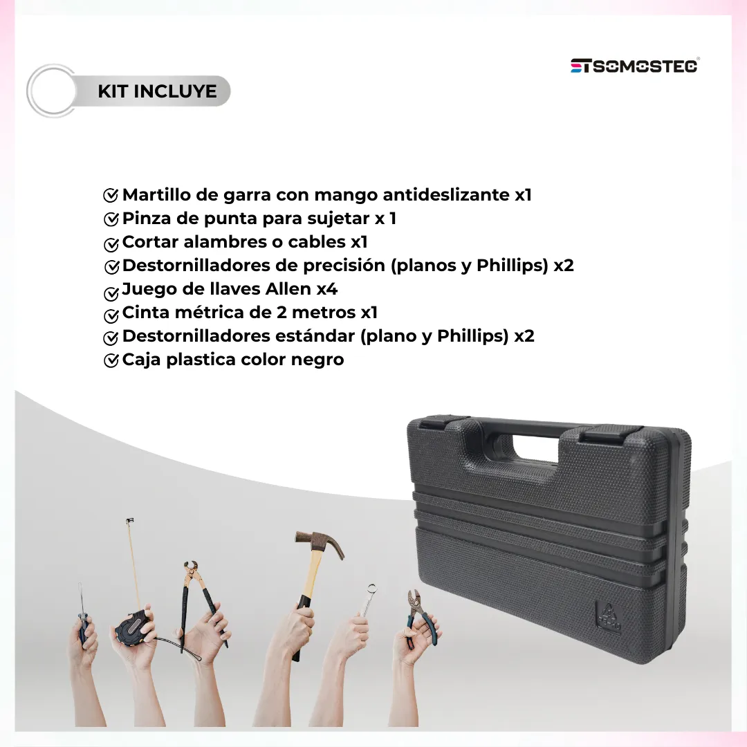 El kit esencial incluye las herramientas más útiles para reparaciones básicas y proyectos de bricolaje. Su dise?o compacto y ligero asegura que puedas almacenarlo cómodamente y llevarlo a cualquier lugar. Además, cada herramienta está fabricada con materiales de alta calidad que garantizan resistencia y durabilidad.