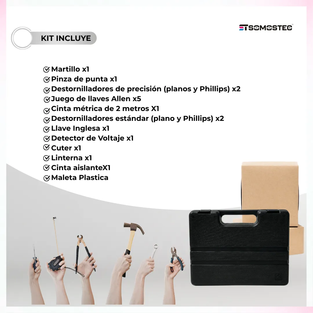 Este completo set de herramientas es ideal para reparaciones en el hogar, oficina, auto o cualquier proyecto de bricolaje. Su práctico estuche mantiene todas las herramientas organizadas y listas para usar en cualquier momento.