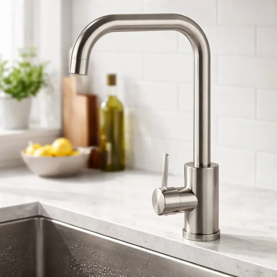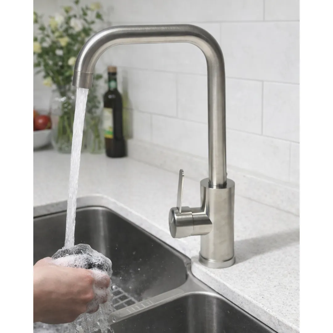 Fabricado con acabado tipo acero inoxidable cepillado, ofrece una estética elegante y contemporánea que se adapta a distintos estilos de cocina. Su pico alto y curvo facilita el lavado de utensilios grandes, mientras que su estructura robusta garantiza resistencia y durabilidad frente al uso cotidiano.
