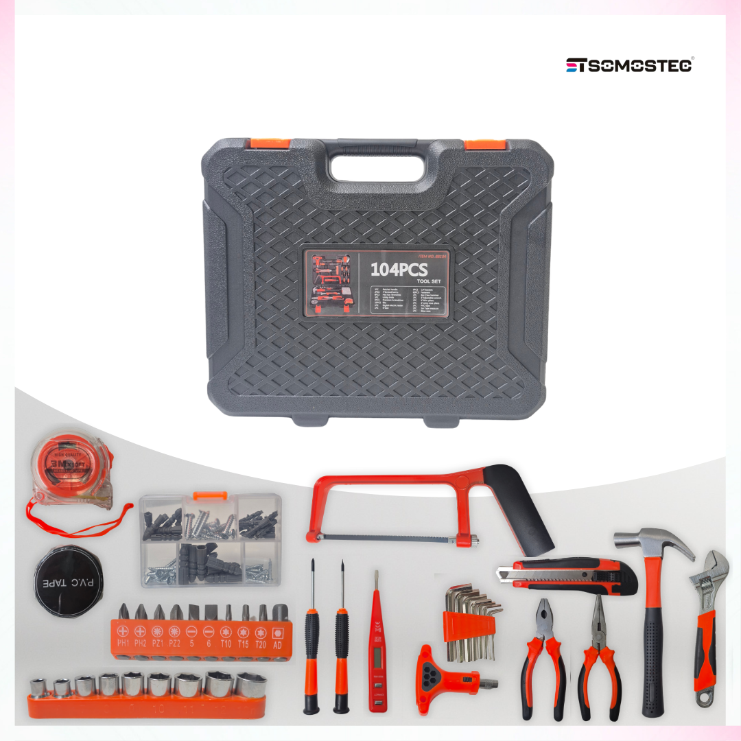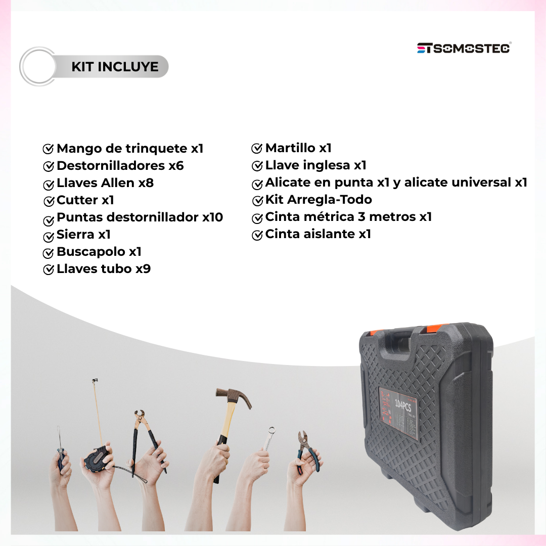 El set de herramientas de 104 piezas es un aliado confiable y multifuncional para cualquier reparación o proyecto. Su dise?o compacto y la calidad de sus componentes lo convierten en una inversión inteligente para el hogar o el trabajo profesional.