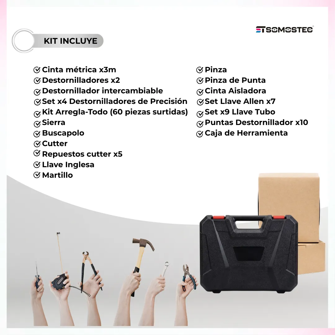 Incluye una amplia variedad de herramientas esenciales como destornilladores, puntas intercambiables, llaves, alicates, dados y accesorios, todo cuidadosamente organizado en un práctico maletín resistente que facilita su transporte y almacenamiento.